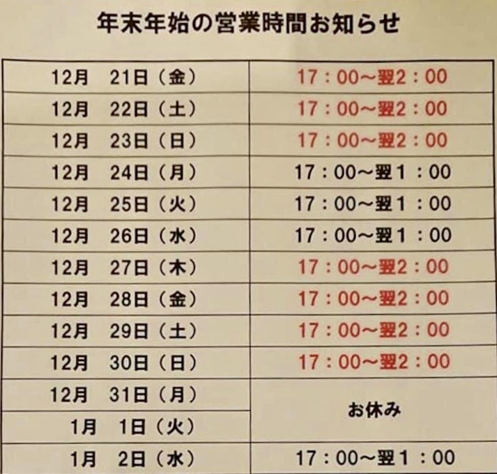 お知らせ 年末年始のご案内! Tweet 2018.12.24 年末年始は、大晦日と元旦のみ、お休みさせていただきます!27日から30日までは営業時間がいつもより長く、翌日2時までになります!週末は残りのお席も僅かになってきていますので、お問い合わせしてからの来店お願いします!