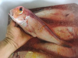 美しいアマダイを魚を傷つけないクラッシュアイスでしっかり冷やして運びます。