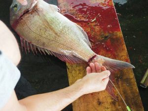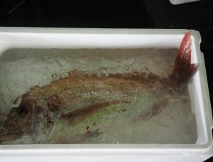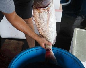 目利きした活マダイを落札しました。さあ活き〆、放血、神経抜きを始めます。