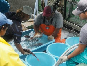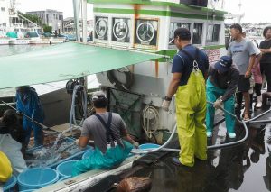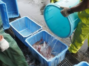 カンコウ(船の生け簀)から大きダモで揚げた魚は海水を満たした大ダライにあけられ、大きさ別に分けられます。
