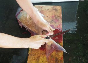 続いて尾ビレのつけ根に包丁を入れて断ちます。