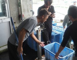 生け簀から揚げた大きさ別に分ける仕事はスピード勝負、活きのよいままを一番に船か、計量、競り場へとリレーされます。