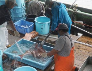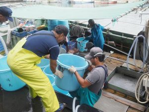 船から次々に揚げらるマダイや、マアジ、魚と海水を満たしたこの重さは驚くほど、漁師さん働きに感謝しています。
