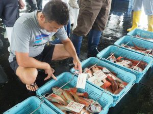 舞阪漁港のアカムツの競りは昼12時から、夏の舞阪を彩るもうひとつの魚わアマダイと共に市場に並びます。よりよい魚を目利きし、魚のプロたちと競り合います。