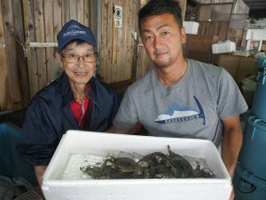 いいガニを落札したね。褒めていただいたのは舞阪漁港の仲買人さんの加藤さんです。
