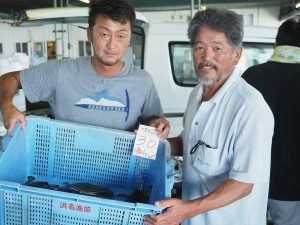 カニ網の名手の漁堅丸(りょうけんまる)の中塩船長のガザミを落札、新鮮のバトンを受けました。