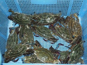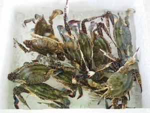 ガチガチと甲羅とツメを鳴らすガザミを軽く水氷すればおとなしくなり、傷なく運べます。舞阪漁港のカニが旬を迎えています。