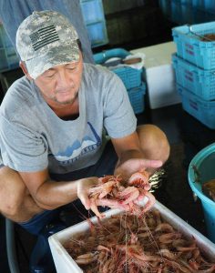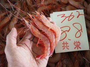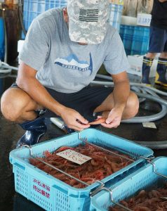 競りの前に目利きするのは大きさとふっくらと育ったエビの美しさです。