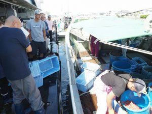 舞阪漁港の底曳き漁船共栄丸が市場に横着けして水揚げを始めます。水平線あたりの200メートルもの深海の魚、エビ、カニたちが揚がります。