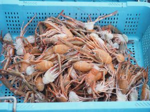 舞阪漁港の底曳き漁で揚がる美しい深海エビの中で最も水揚げ量が少なくは貴重なエビがコシオリエビです。尾の先を内側に曲げていることから名づけられています。