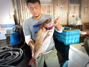 舞阪漁港は年末まで続くタイ網漁の漁期、水揚げされた活マダイを市場で即〆血抜きして神経〆が約束です。