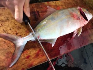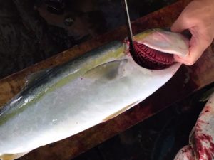 水から揚げても飛び撥ねるほどのカンパチを活〆、エラから脊椎と血管を断ちます。