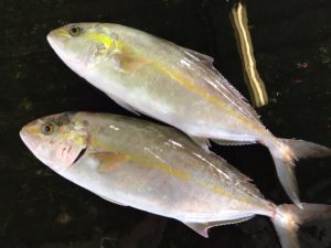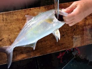 舞阪漁港のタイ網に混獲されるカンパチを紹介します。ブリ三族の末っ子がカンパチ、ブリ、ヒラマサ同様に刺身で高級ですが、カンパチは幼魚刺身て楽しめる魚です。
