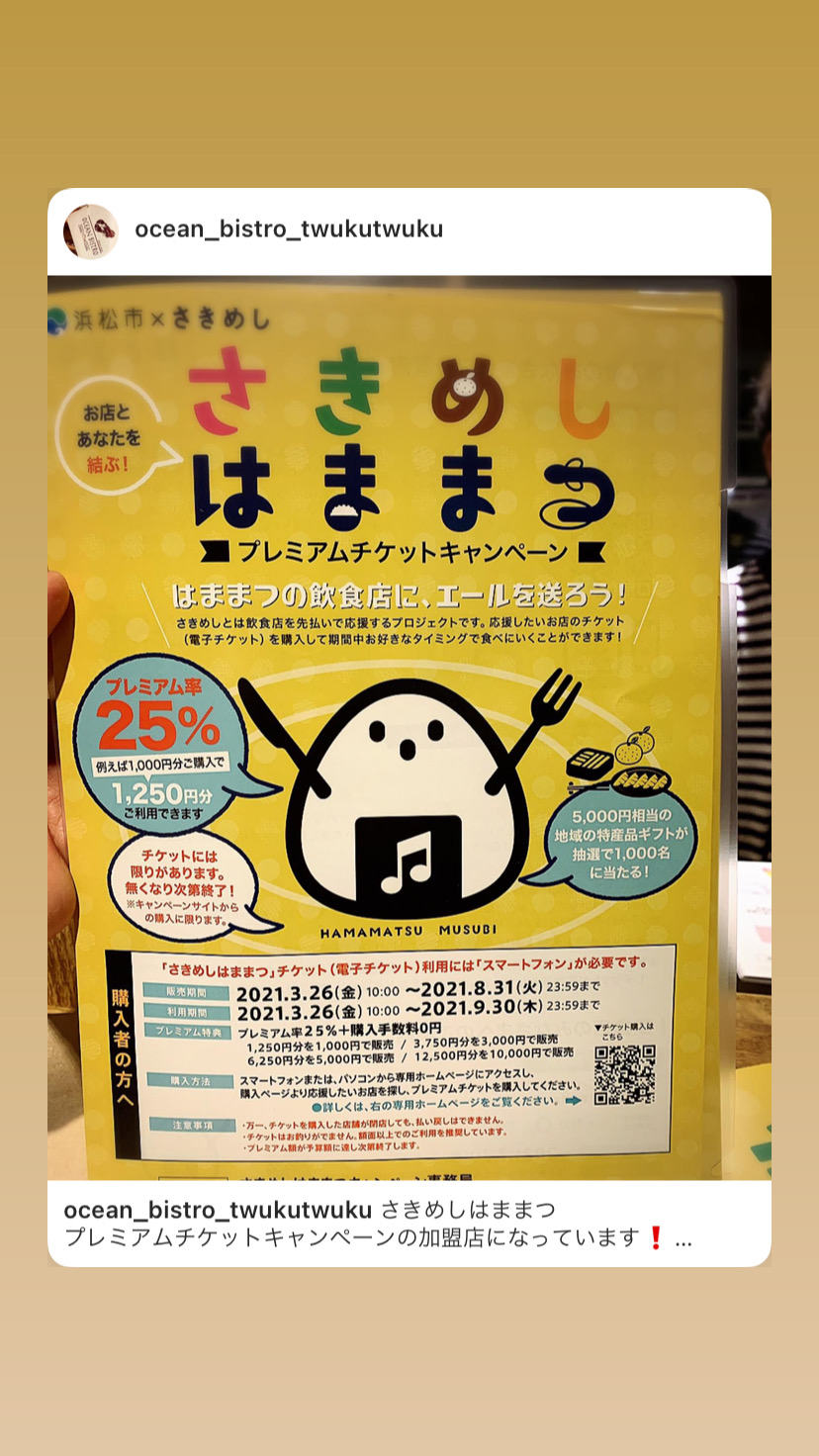 お知らせ さきめしはままつ Tweet 2021.03.27 https://hamamatsu.sakimeshi.com/さきめしはままつのプレミアムチケットキャンペーンはかなりお得になっていますのでぜひチェックしてみて下さい!